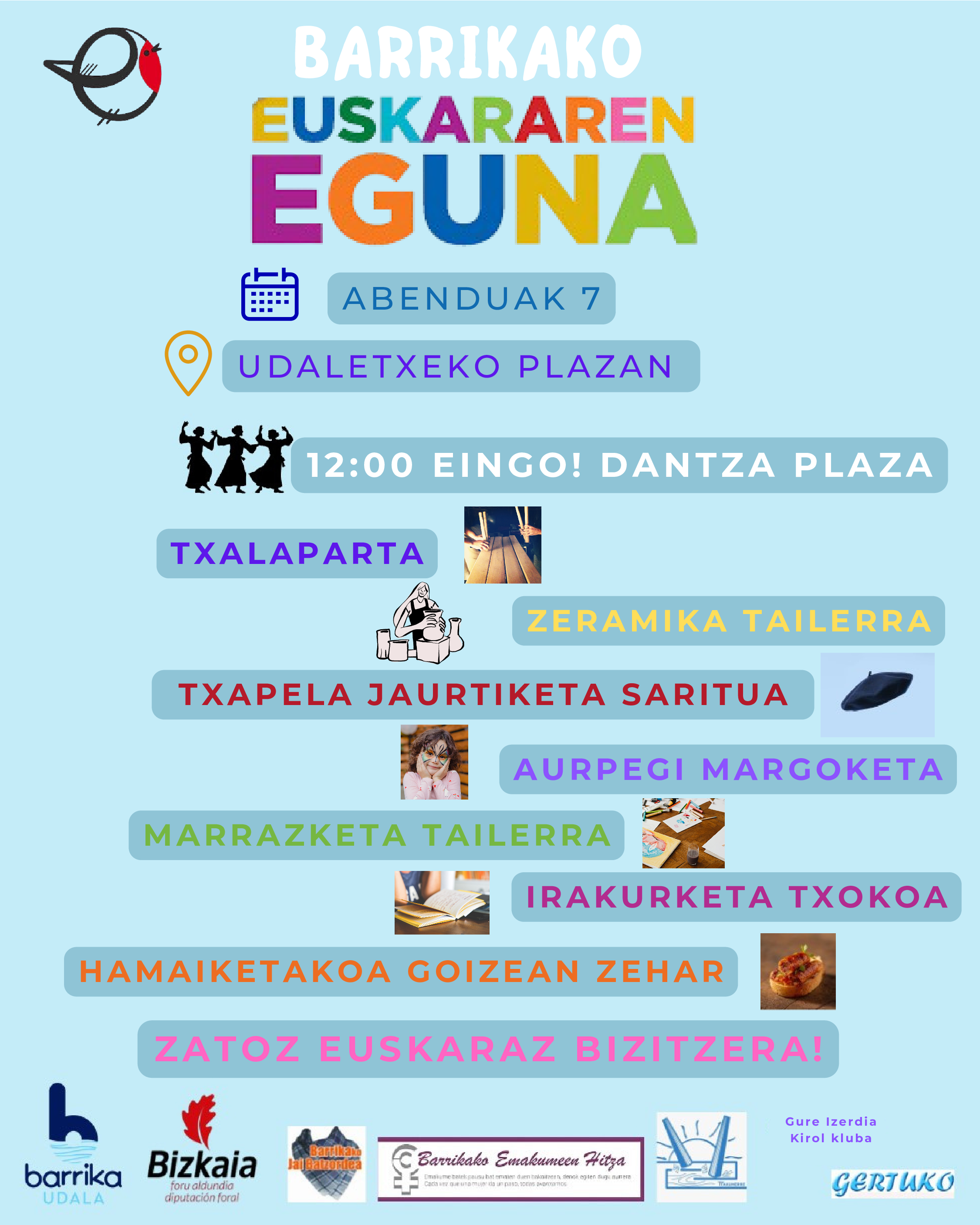 Dantza eta musikaz gozatzeko Eingo! taldearen eskutik hasiko dira ekintzak. Goizean zehar hamaiketakoa izango da plazan gerturatzen diren guztientzat. Erromeria egiten den bitartean, herriko elkarteek antolatutako beste jarduera batzuk ere egingo dira, hala nola, txalaparta, zeramika tailerra, txapela jaurtiketa, aurpegi margoketa, marrazketa tailerra eta irakurketa gunea. Barrikako Udaleko Euskara Zinegotzia, Gixane Muñizek, “Jai Batzordea, Emakumeen Hitza, Gure Ixerdia, Gertuko eta Ttakunerre bezalako elkarteek urte osoan zehar gure hizkuntzaren alde egiten duten lana eta, bereziki, egun hau zerbait oso berezia izan dadin Udalarekin egiten duten elkarlana” nabarmendu ditu.