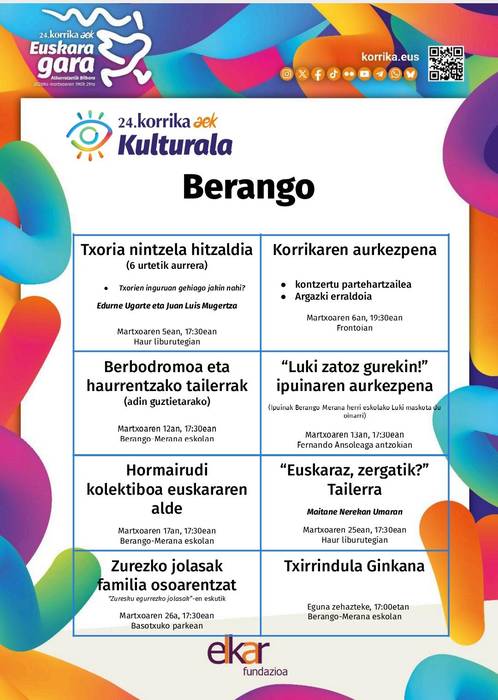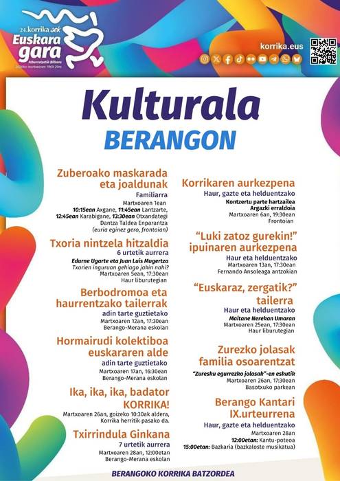 Martxoaren 12an, 17:30ean, Berango-Merana eskolan, berbodromoa eta haurrentzako tailerrak antolatuko dituzte, adin guztietara zabalik. Era berean, martxoaren 17an, 17:30ean, Berango-Merana eskolan, hormairudi kolektiboa margotuko dute euskararen alde.