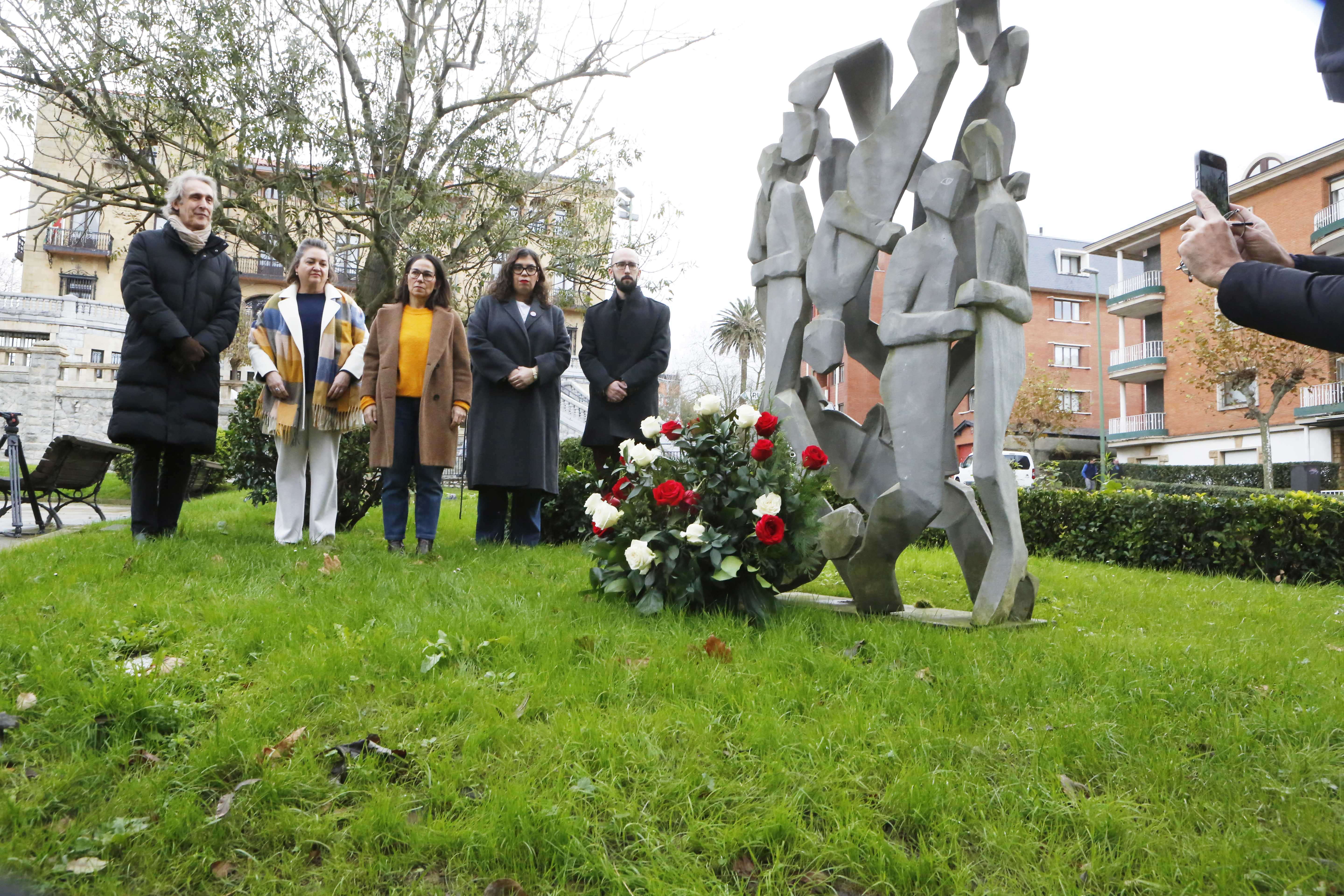 Txistulariek Agur Jaunak interpretatzen zuten bitartean, minutu bateko isilunea egin zuten. Ondoren, ekitaldia amaitzeko, Amaia Agirre alkateak lore sorta bat utzi zuen San Inazio plazan terrorismoaren biktimen omenez dagoen Guztion etxea izeneko eskulturaren oinean.