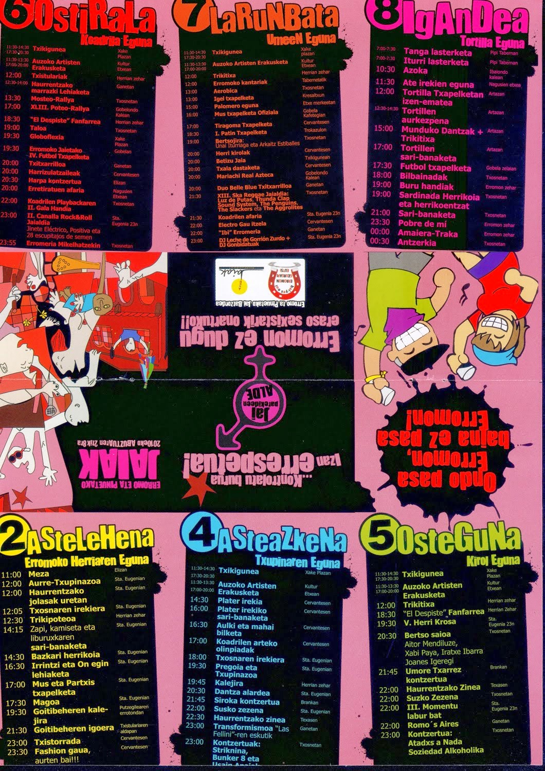 Itzubaltzeta / Romo eta Pinuetako jaiak direla eta, trafikoa berrantolatzeko hainbat neurri hartuko ditu Getxoko Udaltzaingoak, Leioakoarekin batera. Horien artean, abuztuaren 9ra arte, jai esparrua itxita egongo da goizeko 6ak arte. Itxierak Errekagane, Kresaltsu eta Aurrezki Kutxa kaleetan eragina izango du (azken egunean, gauerdira arte). Gaur bertan, trafikoa zuzenduko dute Amaia etorbidean eta Gobelaurre kalean, txupinazoaren osteko kalejira dela eta. Bestalde, bihar, osteguna, izango den V. Herri Krosa dela eta, Santa Eugenia kaleko bi aldeetan (Butroi eta Alonso kaleen artean) ibilgailuak kenduko dituzte goizeko 9etatik aurrera, lasterketarako beharrezkoa den azpiegitura ipini ahal izateko. Argazkian, Itzubaltzetako jaiak iaz.