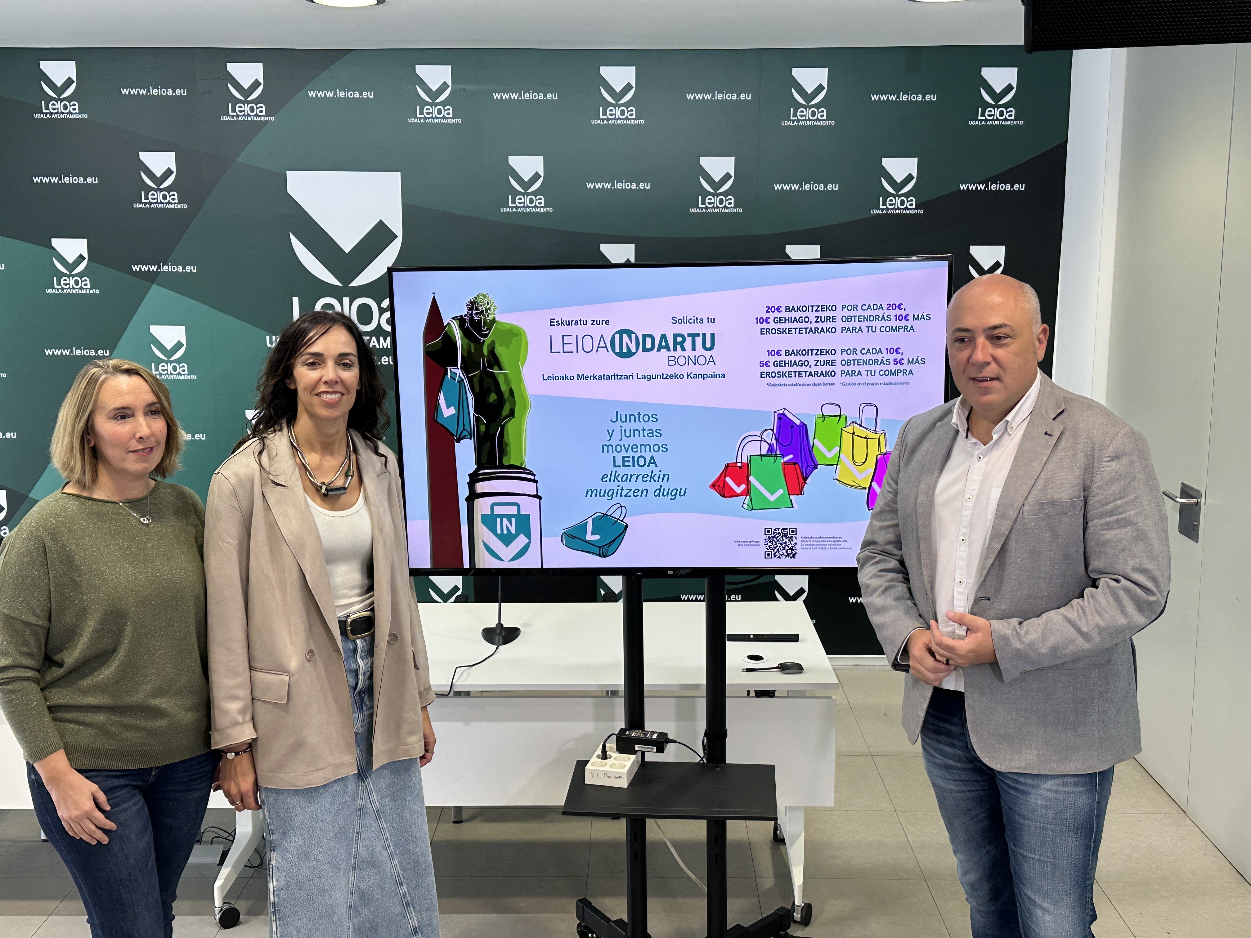 Gaur egin duten ekimenaren aurkezpenean, Iban Rodriguez Leioako alkatea, Itziar San Martin Leioako Saltoki Batuetako kidea eta Zuriñe Urrestarazu Behargintzako zuzendaria egon dira.