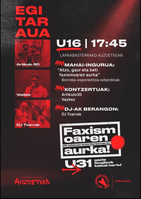 Egitaraua 17:45ean hasiko da "Atzo, gaur eta beti faxismoaren aurka" izeneko mahai-inguruagaz. Bertan, aurreko ziklo politikoetako militante ezberdinek faxismoaren aurkako borrokaren errepaso historikoa egingo dute, ikuspegi desberdinak mahai gainean jarriz.