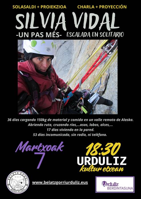Arrastian, 18:30ean, kultur etxean, Silvia Vidal alpinistak hartuko du lekukoa. "Un pas més" dokumentalean, bakarkako eskaladan bizitako esperientziak ikuslea muturreraino eramatea du helburu: 36 egunez materiala bizkarrean, 17 egun horman eta 53 egun erabateko isolamenduan. Ausardia eta erresilientzia, lehen pertsonan.