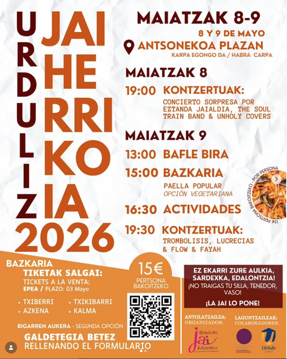 Zapatuan, berriz, eguna giro herrikoiagoan hasiko da. 13:00etan bafle bira egingo da, eta 15:00etan bazkari herrikoia izango da; paella izango da plater nagusia, aukera begetarianoagaz. Antolatzaileek jakinarazi dutenez, txartelak maiatzaren 3ra arte egongo dira salgai, 15 eurotan. Arrastian, 16:30ean, jarduera desberdinak antolatu dituzte, eta gauean berriz musika izango da protagonista: 19:30etik aurrera Trombolisis, Lucrecias eta Flow & Fayah taldeek joko dute.