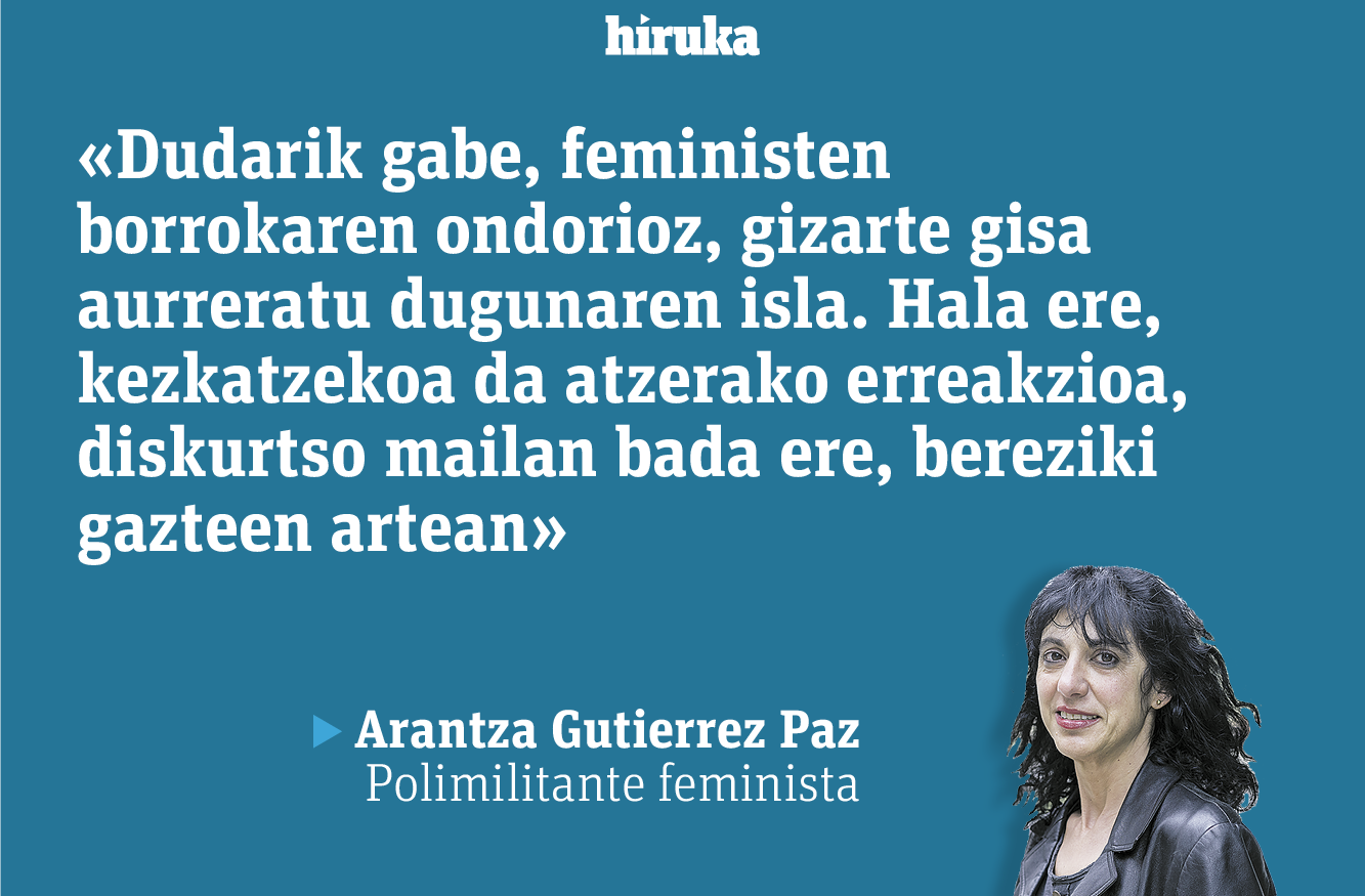 Giza onek ez dute emakumerik jo, are gutxiago zauritu edo, hil, noski. Etxean laguntzen dute eta inplikatuta daude zaintzan. Gainera, kaleko mobilizazioetan izango dira gure ondoan, gure aldarrikapenak beraienak egiten, beharbada gu baino ozenago eta nabarmenago. Dudarik gabe, feministen borrokaren ondorioz, gizarte gisa aurreratu dugunaren isla. Hala ere, kezkatzekoa da atzerako erreakzioa, diskurtso mailan bada ere, bereziki gazteen artean.